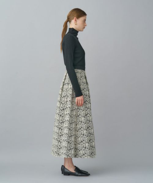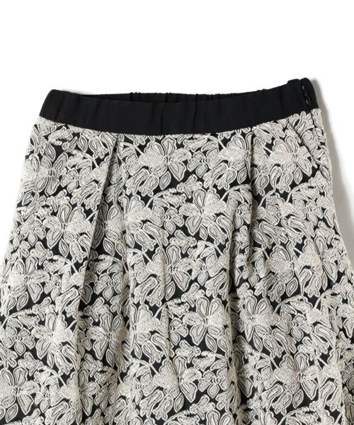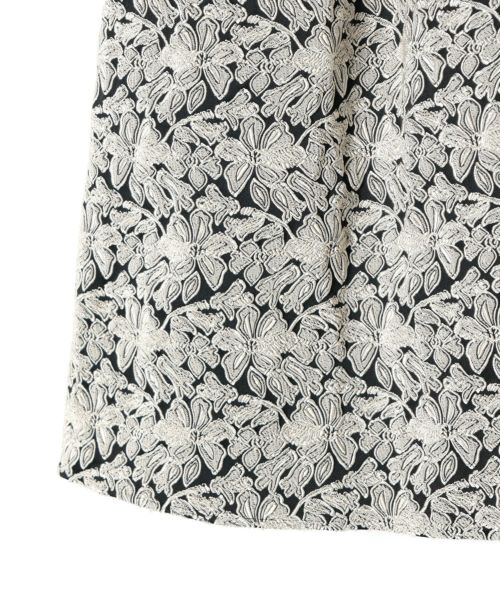 フラワー柄が連なって表現されたジャガード素材を使用。程よいハリ感と立体的な陰影が、スタイリングに高級感をプラスします。シンプルなトップスと合わせるだけで、華やかで上品なコーディネートが完成します。