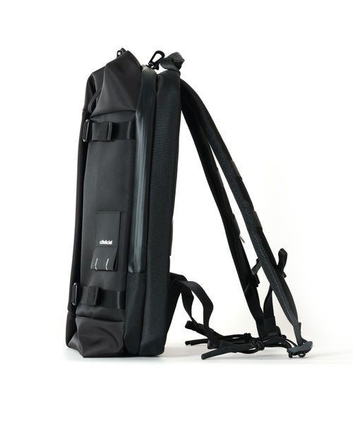 【デザイン】cote&ciel(コートエシエル)のバッグ。YUKONは驚くべき機能を備えたコンパクトなバックパックです。フロントの 2 つのバックルを開くと、キュービック状の前面コンパートメントが最大容量まで拡張されます。