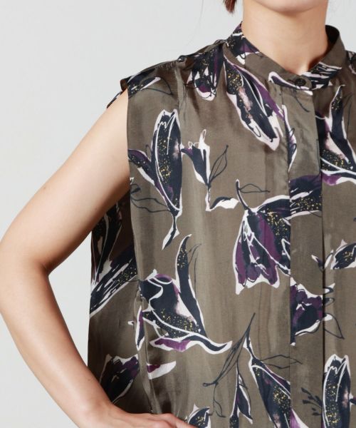【デザイン】SACRA(サクラ)のブラウス。2025AUTUMNを象徴する、大胆で美しい大花プリントが目を惹く一枚。シンプルなシルエットに、アートのようなテキスタイルが映える、存在感のあるデザインです。肩まわりをすっきり見せてくれるノースリーブ仕様で、腕が自然と華奢に見える絶妙なバランス。凛とした印象のスタンドカラーに、前開きデザインが軽やかさを添え、程よい抜け感を演出します。着るだけでコーディネートが決まる、主役級ブラウスです。