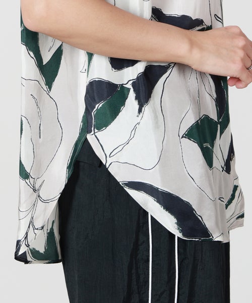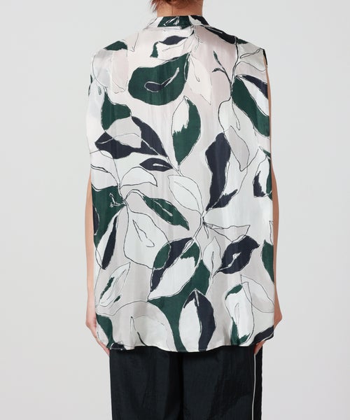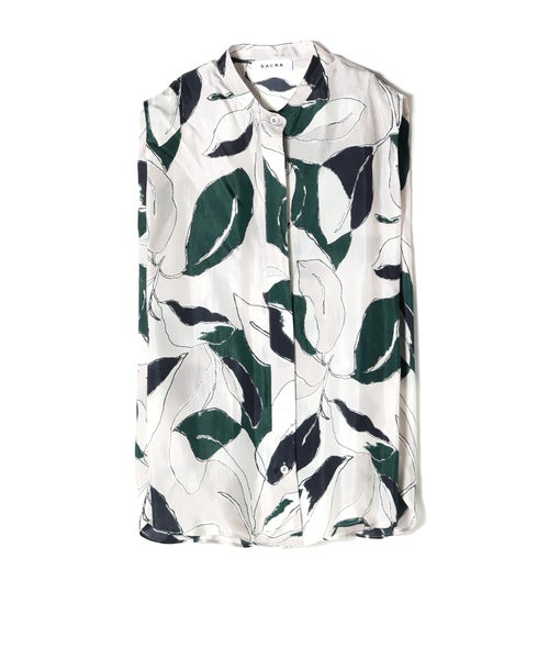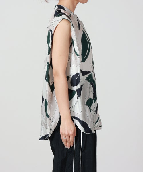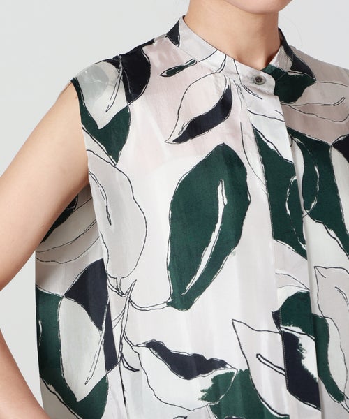 【デザイン】SACRA(サクラ)のトップス。ドローイングタッチで描かれたリーフ柄が印象的なノースリーブバンドカラートップ。モスグリーンをアクセントにしたシックな配色が、大人の落ち着いた雰囲気を演出します。肩先を折りたたんだようなショルダーデザインが立体感を生み、シンプルながらもニュアンスのあるボックスシルエットに。身体のラインを拾いにくく、リラックス感のある着心地も魅力です。一枚で主役になるデザインはもちろん、同素材のパンツとのセットアップで統一感のある洗練されたスタイルもおすすめです。