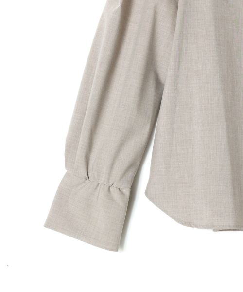 カフス切り替えにゴムを仕込んで、袖をたくし上げて留まるように設定してます。パワショル部分はタックを入れて立体的に仕上げており、ギャザーでなく肩が張りすぎないようこだわって調整を施したブラウスです。
