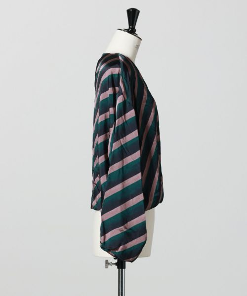 【デザイン】DRIES VAN NOTEN(ドリス ヴァン ノッテン)のブラウス。ストライププリントがアートピースのような存在感を放ちます。ぜいたくな生地使いが魅せるボリューム感は構築的で、抜け感と存在感がリュクスモードなブラウス。ボトム次第でドレッシーからカジュアルのミックスコーデまで幅広い活躍が期待できそう。