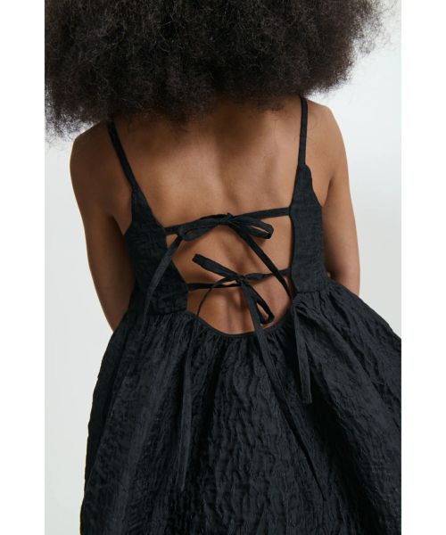 【デザイン】 Cecilie Bahnsen(セシリー バンセン)のトップス。ロマンティックでモダンな印象を与える「Akira トップス」は、Cecilie Bahnsenらしい繊細なディテールが際立つ一枚。ギャザー入りのヒップパネルと、背中を美しく魅せるオープンバックは、リボンで結ぶデザインが特徴的です。ショルダーストラップにもリボンを配し、全体にフェミニンなアクセントをプラス。ストレートネックラインが甘さをほどよく引き締め、洗練されたバランスに仕上がっています。