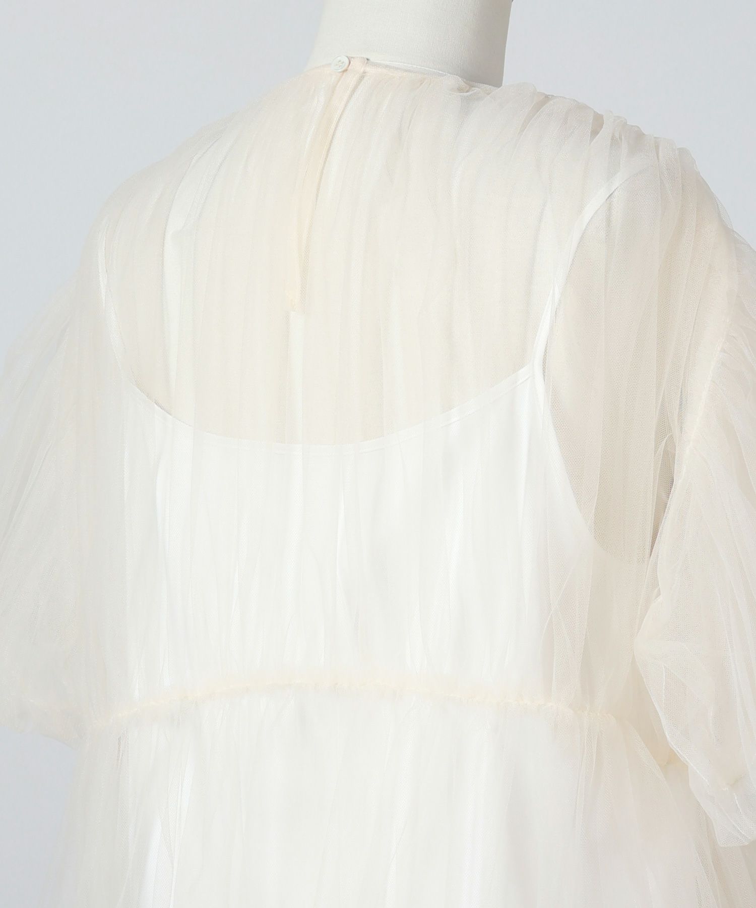 【デザイン】Chika Kisada(チカ キサダ)のチュールトップス。ブランドを象徴するチュール素材を用いた、軽やかで女性らしい表情が魅力の一着です。透け感のあるトップスとインナーがセットになっており、レイヤードを計算せずともバランスの取れたスタイリングが完成します。お手持ちのドレスやインナーなどインナーを調整すればオールシーズンで着回せるため、1年を通してさまざまなコーディネートに取り入れやすいのも魅力です。