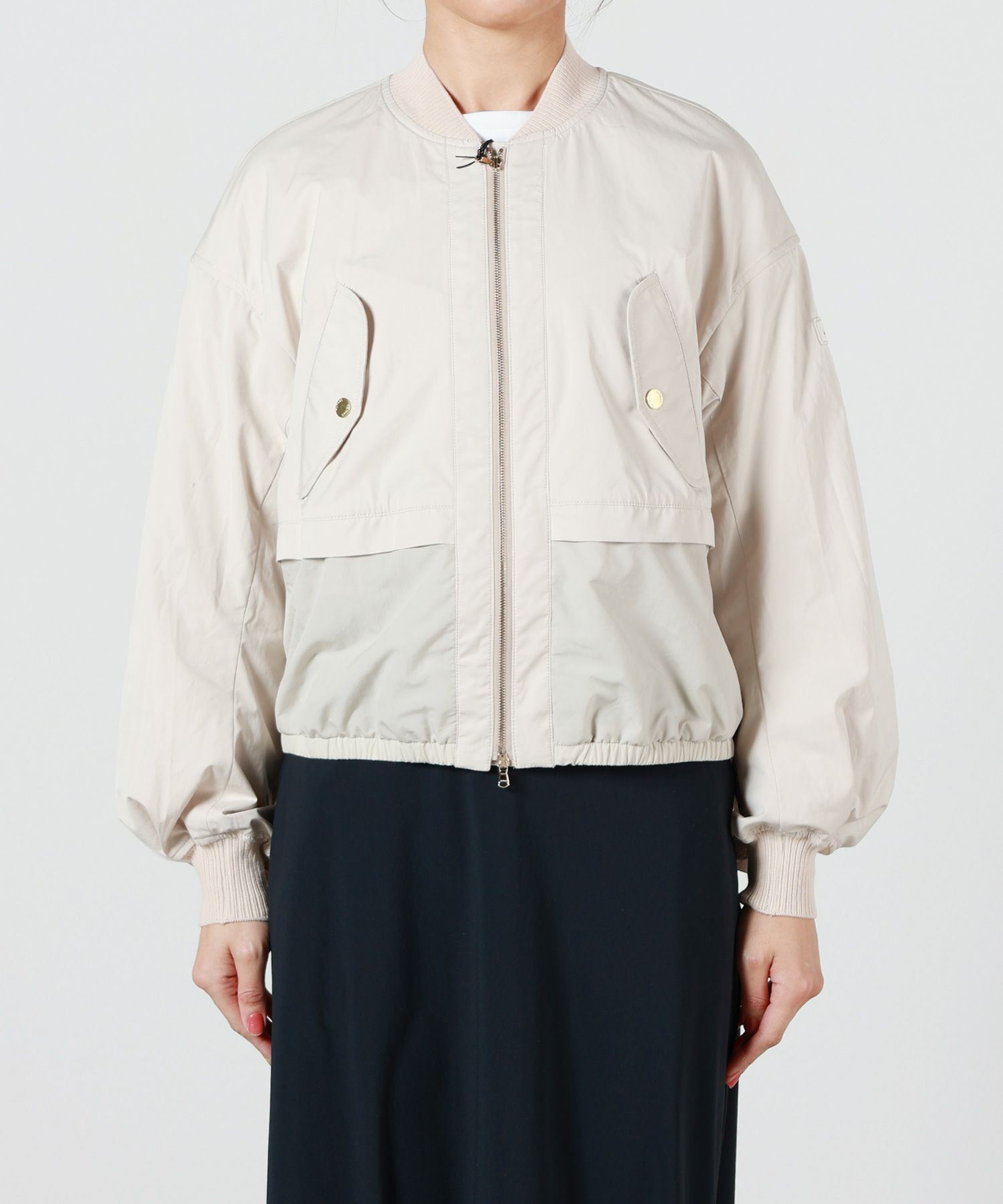 【デザイン】TATRAS(タトラス)のジャケット。身裾を同色別素材で切り替えたMA-1です。マニッシュなディティールのMA-1と、女性的なブラウジングスリーブの組み合わせが特?的なデザインです。バランスの取りやすい着丈で、どんなコーディネートにもマッチします。