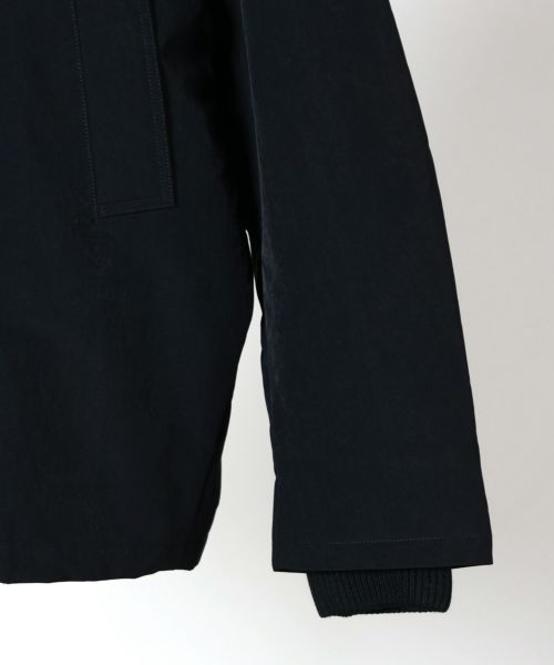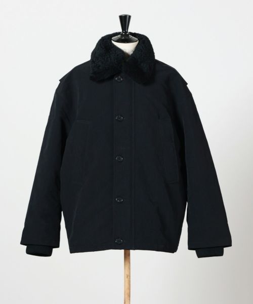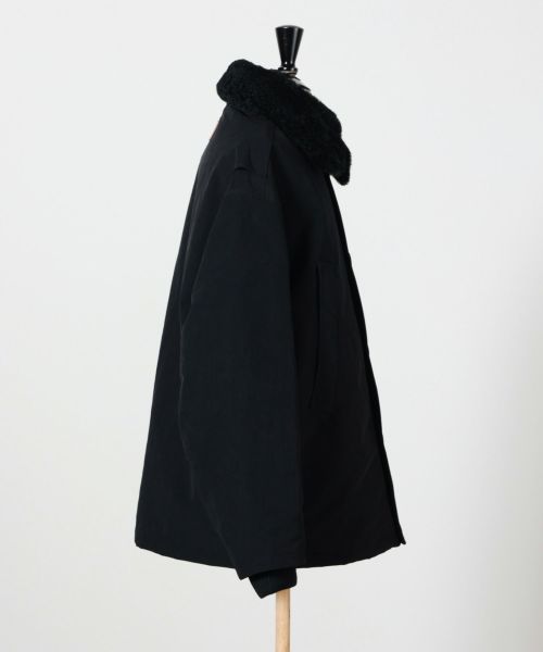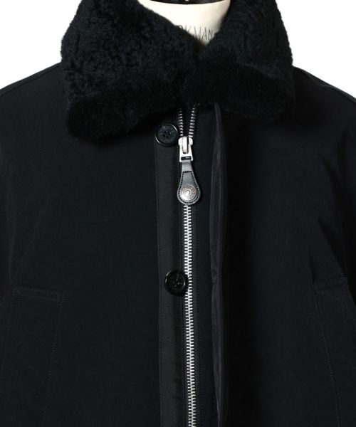【素材】表地には厚手起毛のヴィンテージ風ナイロン素材を採用し、耐久性とモダンな雰囲気を兼ね備えています。襟部分には高級ラムシアリングを使用。滑らかな起毛感がラグジュアリーなアクセントとなっています。裏地と中綿にはともにポリエステル素材を用い、軽量ながら保温性を確保。総裏仕様で仕立てが丁寧な一着です。