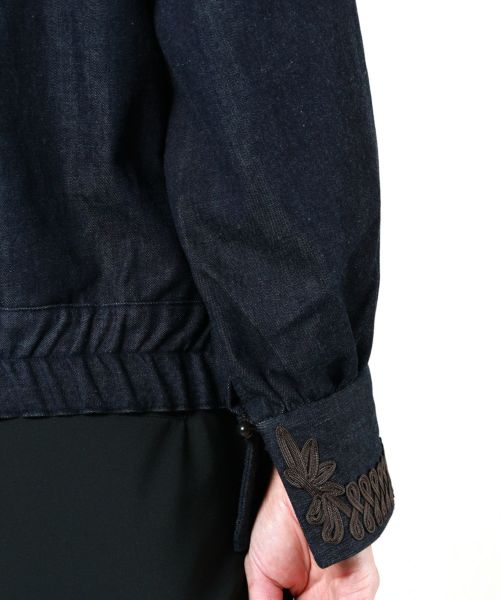 【デザイン】 LOKITHO(ロキト)定番のコード刺繍を使用したブルゾン。袖とカフスにコード刺繍を配置し、少し高めの襟と、長めのカフスでモード感のある仕上がりに。ウエストにゴムが入っており、コンパクトなシルエットが特徴。