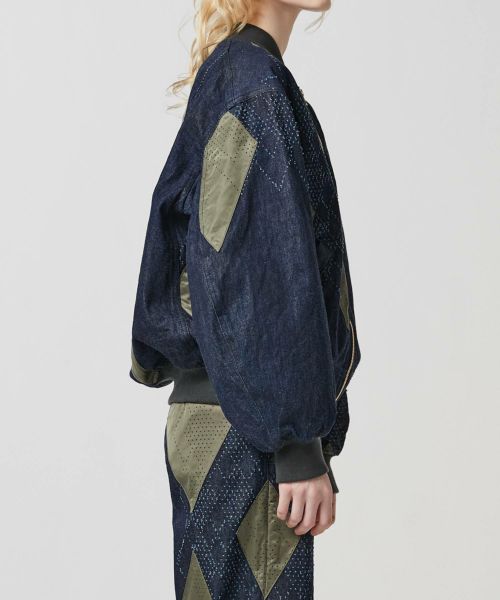 【デザイン】デニムとナイロンをコンビネーションで合わせたMA-1ジャケット。 レーザーによるパンチング加工でアーガイル柄を表現しており、縫製後に洗いをかけることによって、パンチング部分に花が咲き、より立体的な表情が生まれています。 ナイロンをドッキングすることで、華やかな光沢感があるジャケットです。