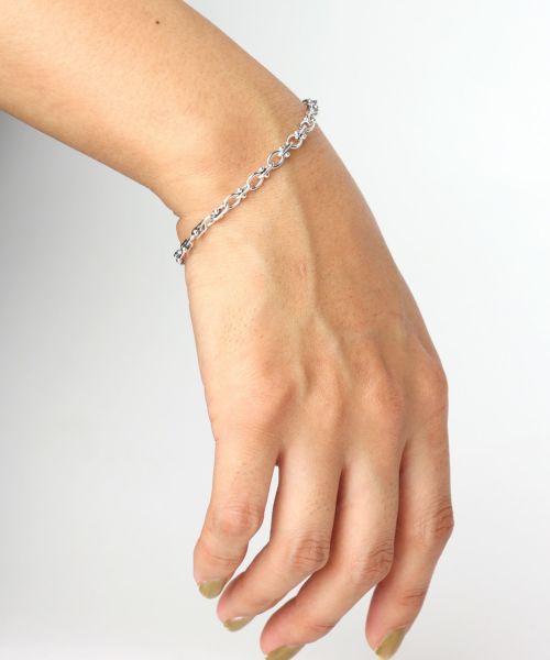 【デザイン】 手元でさり気なく輝かくチェーンブレスレット。華奢なデザインで主張が強すぎることは無く、シンプルで飽きのこないデザインです。小ぶりのチェーンにはデザインアクセントとなる短い棒状のモチーフが施され、細やかな動きをもたらします。