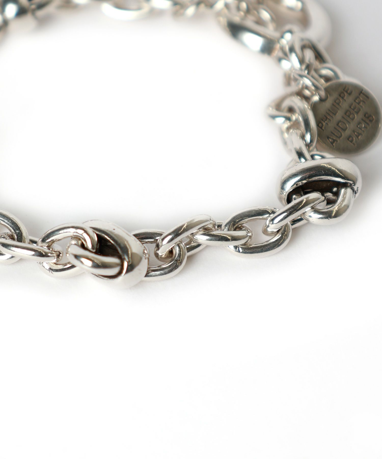 【デザイン】 Philippe Audibert(フィリップ オーディベール)のブレスレット。美しいバランスで配置された特徴的なチェーンが存在感がありながらもどこか控えめな印象を与えるモダンで上品なアイテム。Tカンの留め具ディテールがさりげないアクセントになっており、単体でも重ねづけでも様々なシーンで活躍します。