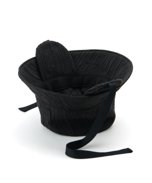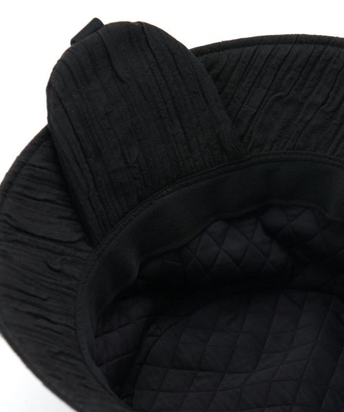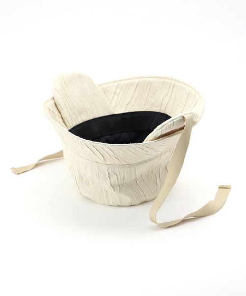 【デザイン】La Maison de Lyllis(ラメゾンドリリス)のバケットハット。素材の質感を活かすようにシンプルなシルエットとボリュームにこだわられたデザイン。イヤーフラップとリボンがポイントで顎でリボンを結んだり、リボンは垂らしたまま被ったりとアレンジを楽しんでいただけます。