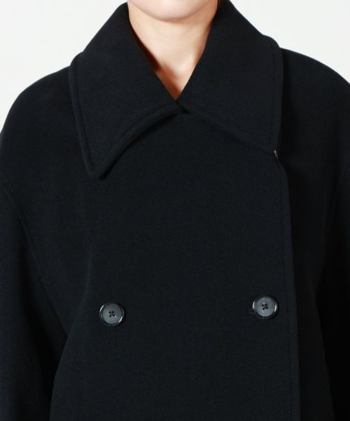 【デザイン】TOTEME(トーテム)のコート。ダブルブレストのボタンフロントと、すっきりとした襟、裾に向かって長めに広がるオーバーサイズのシルエットが特徴です。ボタンにはTOTEMEのロゴ入りです。そのままはもちろん、襟を立てて着こなすのもおすすめです。