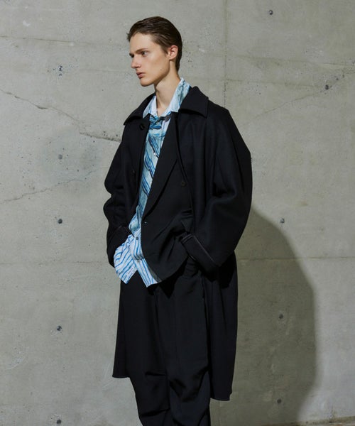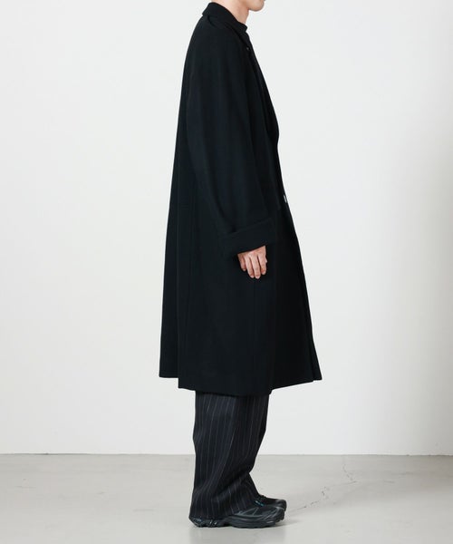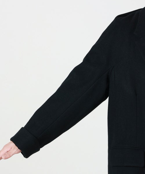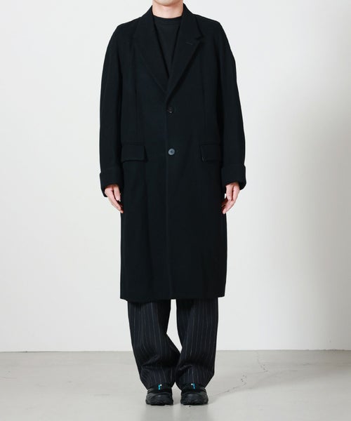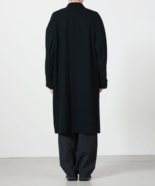 【デザイン】 OVERCOATのコート。高密度に織り上げた上質なメルトンウールを採用したノッチドラペルのコートです。保温性とハリ感を兼ね備えた一着。シンプルな中にも構築的なフォルムが際立ち、洗練されたシルエットを演出します。ノッチドラペルのクラシックな襟元とオーバーサイズシルエットが絶妙に調和し、トラディショナルでありながらモダンな印象に仕上げています。裏地付きで滑らかな着用感があり、秋冬のアウターとして長く活躍します。