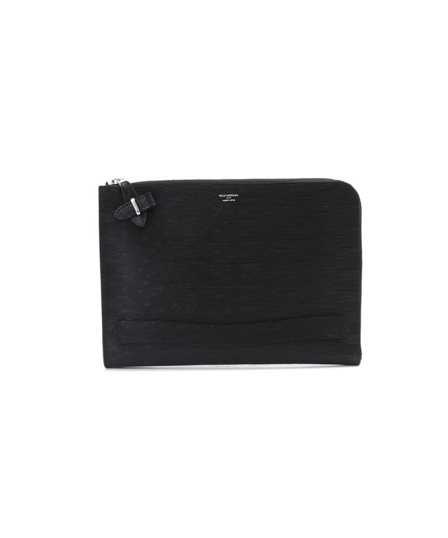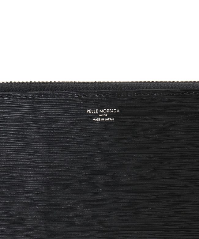 オフスタイルはもちろん、パーティーシーンでもクラッチバッグが活躍。このクラッチバッグはオリジナル型押しの革を贅沢に使用し、大人の男らしい仕上がりにしました。正面にはペッレ モルビダらしい曲線的なハンドルが付属し、手を通しても持ちやすく、機能性もしっかり。引き手を止める金具&ベルト使いがデザインのワンポイントになっています。