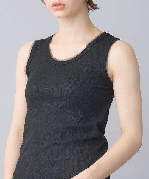【デザイン】 チュール素材のレイヤード風タンクトップ。内側のリブ生地は程よく厚みがあり透けにくく、着心地の良い肌触りです。ネック周りと肩周りのチュールがさりげないアクセントを添えます。ジャケットのインナーに、オフショルダートップスと重ねて、一枚でデニムなどと合わせでヘルシーに、と幅広いコーディネートで活躍します。