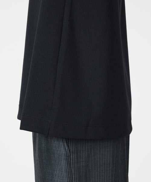 【素材】 ポリエステルをベースにレーヨンとポリウレタンをブレンドした生地を使用。手に取ると滑らかで柔らかく、肌に触れた際のひんやりとしたタッチが心地よいのが特徴です。軽やかでドレープ感があり、着用時には自然な落ち感が生まれ、上品な印象を演出します。ストレッチ性にも優れているため動きやすく、長時間の着用でもストレスを感じにくい仕上がりです。シワになりにくく扱いやすい一方で、素材特有の落ち感があるため、保管時はハンガー掛けがおすすめです。