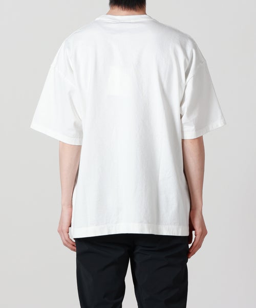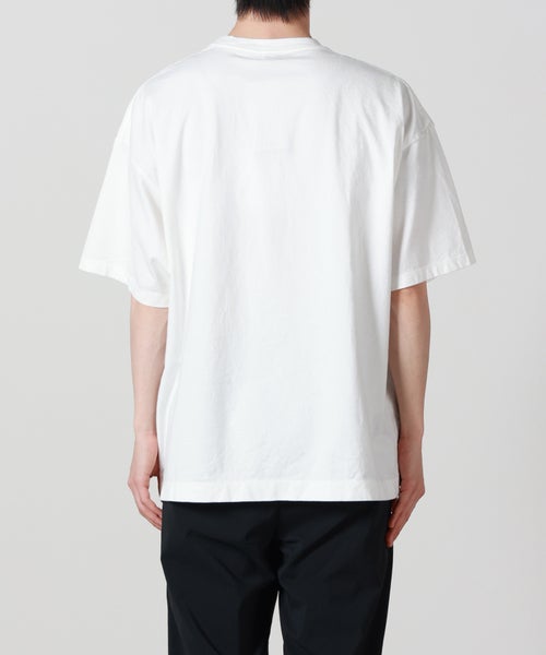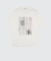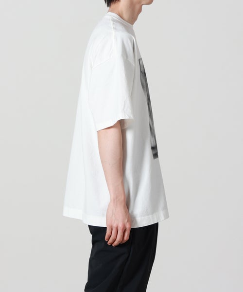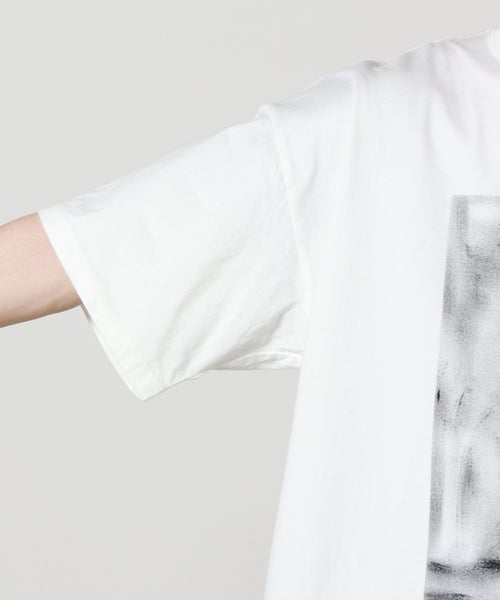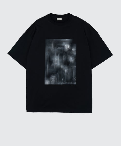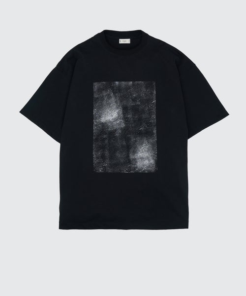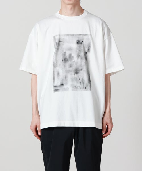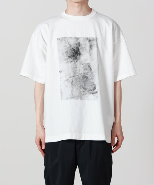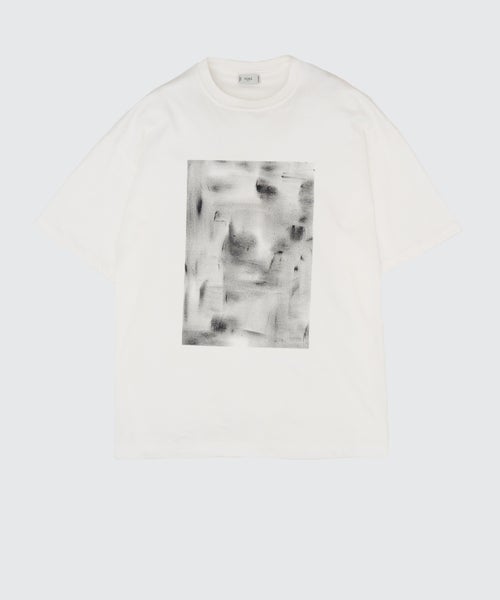 【デザイン】YOKE(ヨーク)のTシャツ。「フロッタージュ」の技法をイメージし手書きで削り出したような模様をフロントに大胆にプリントしたデザインが特徴です。都会的でモードな雰囲気を醸します。手作業でプリントしているので、1点1点柄が多少異なるのも魅力です。
