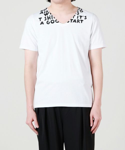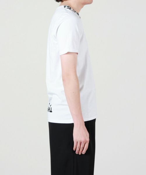 【デザイン】 MM6 Maison Margiela(エムエムシックス メゾン マルジェラ)のカットソー。襟元と背面にプリントのデザインが施されたVネックショートスリーブカットソーです。フィッティングはゆとりはあまり感じられないストレートな印象。夏場のシンプルになりがちなコーディネートにワンアクセント加えてくれる、デザイン性の高さも魅力的です。
