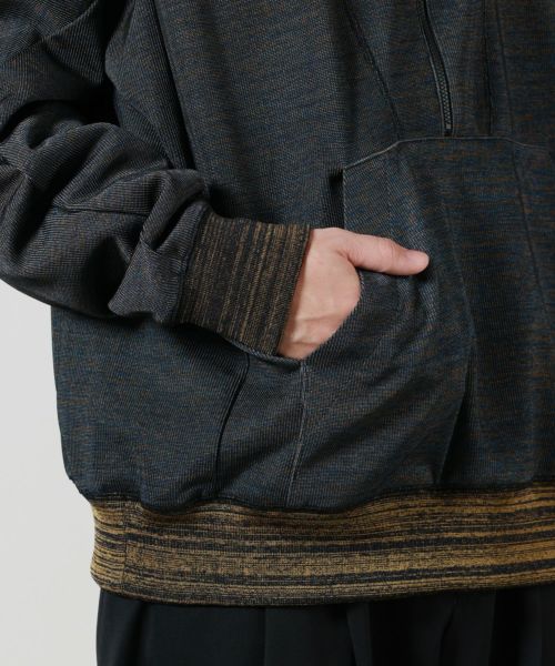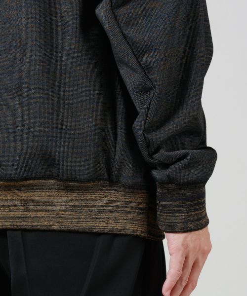 【デザイン】 TOGA VIRILIS(トーガ ビリリース)のプルオーバー。ミックス感が際立つ独自開発のギャラクシージャージー素材を使用。リブ編みの立体感とハーフジップの機能美に加え、襟裏のロゴアクセントがさりげない個性をプラスします。モードな雰囲気とスポーティーさが絶妙に融合したデザインで、洗練されたスタイリングに最適な一着です。