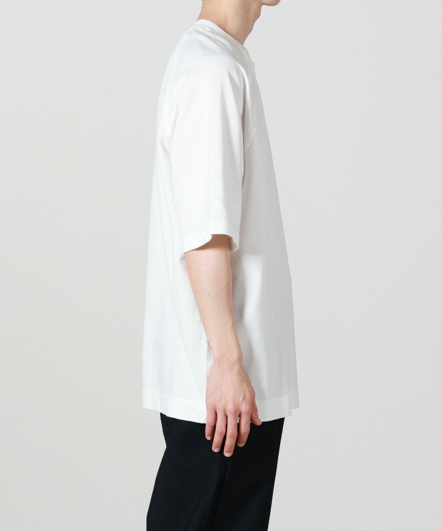 【素材】 綿100%ならではのやわらかくドライなタッチが特徴。手に取ると軽やかで、肌に触れた瞬間も心地よく、デイリーに着てもストレスを感じにくい素材感です。表面はフラットで清潔感があり、カジュアルながらもラフになりすぎず、幅広いスタイリングに取り入れやすい印象に仕上がっています。