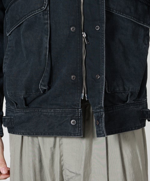 【デザイン】YOKE(ヨーク)のブルゾン。スタンドカラーが印象的なミニマルデザインのデニムブルゾン。裾に施した2タックにより、立体的で丸みのあるシルエットを構築し、シンプルながらも存在感のある一着に仕上げています。ベルトタブでシルエットの調整が可能で、スタイリングに合わせたアレンジも自在。フロントは隠しドットボタンと逆開ファスナー仕様、袖口にも隠しドットボタンを採用することで、より洗練されたクリーンな印象に。大型のフラップ付き腰ポケットは、上部とサイドの両方からアクセスできる機能的なデザインで、実用性とデザイン性を兼ね備えています。