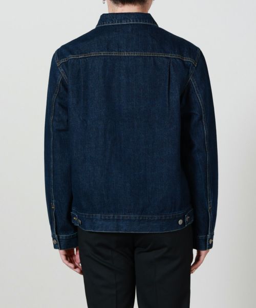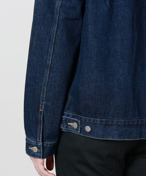 【デザイン】ミニマルなデザインで構築したデニムジャケット。身頃に配置された胸ポケットのシングルステッチやフロントのプレーンシルバータック釦など、極力デザインをミニマルにすることで、綺麗で上品な顔付きに仕上げられています。前立て裏側には、贅沢にセルビッチを使用。意匠としての役割も果たしています。生地はクロキの12.5ozセルヴィッチコットンを採用。TOYODA(現在のトヨタ)のG9型の旧式のシャトル織機でゆっくりと織りあげることで、独特の膨らみとソフトな風合いを出しています。ミディアムインディゴは、敢えて擦りを入れず、程よあたり感を出しています。着用していくと、濃淡のメリハリがでるのも特徴です。