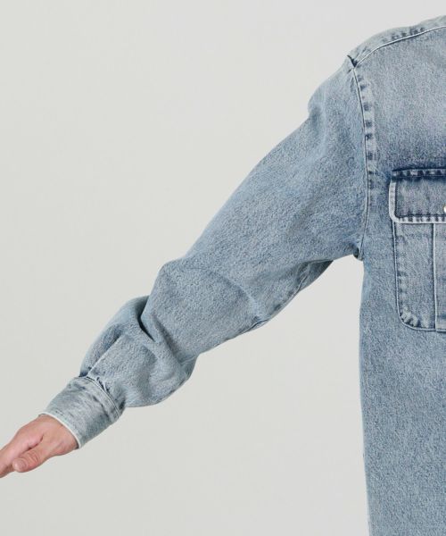 【デザイン】MM6 Maison Margiela(エムエムシックス メゾン マルジェラ)のデニムシャツ。2つの胸ポケット、シルバートーンのスナップボタン、背面のアクションプリーツが特徴です。フェード感のあるライトブルーの色味が、肩の力が抜けた構築美を演出し、デニムでありながら全体のスタイルを綺麗な印象に見せてくれます。そして、バックにあしらわれた1本の白いステッチラインがMM6を象徴しています。