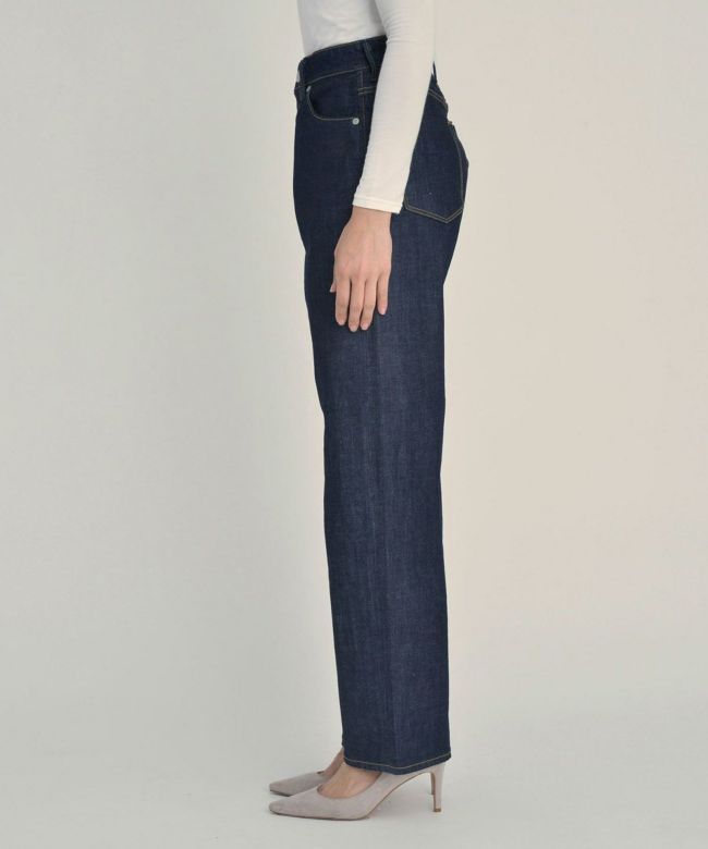 【素材】 定番のストレッチデニムでほど良いハリ感とリラックス感のある履き心地で、硬いイメージがあるワンウォッシュカラーでも快適に穿いていただけます。きれいにまとまるワンウォッシュの色味としっかりと深さのある股上で、カジュアルなトップスはもちろんテーラードジャケットなどのキレイめアイテムとも相性がよく、季節や気分によって合わせるアイテムを変えられる着回し力抜群な1枚です。ウエストベルトの裏地を色移りしにくいデニム生地を使用しているので、トップスインでも穿いていただけます。