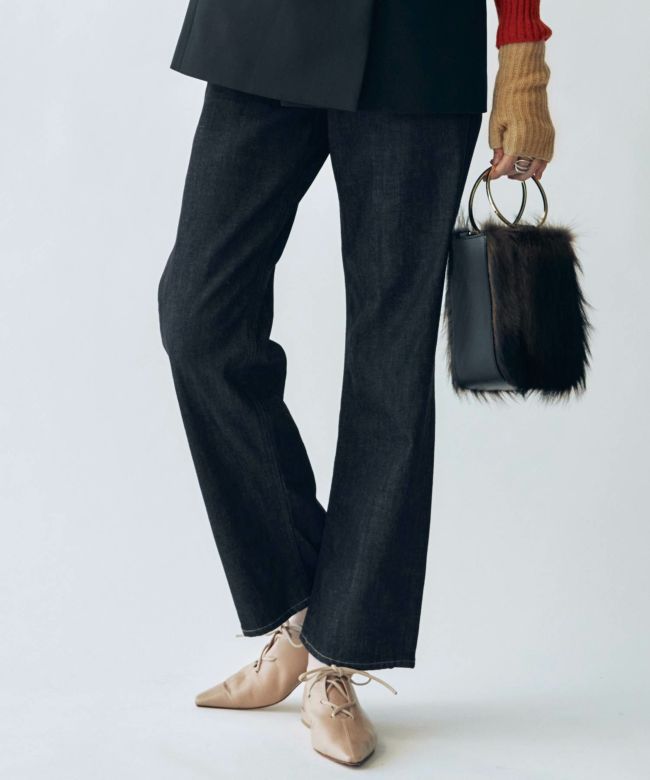 【スタッフ chiaki】 身長:167cm/体型:骨格ナチュラル/年齢:20代後半/普段サイズ:M、L 素材感:柔らかな履き心地ですが、肉感を拾いにくい適度なハリ感があります。 サイズ感:ヒップ周りはフィット感があり、ヒップ下からゆるっとしたストレートライン。気になる脚のコンプレックスをキレイにカバーしてくれ、美脚を叶えてくれます。私の様な長身さんでもフルレングスでお召しいただけます。 おすすめポイント:センタープレスのディティールが脚のラインを真っ直ぐ綺麗に見せてくれ、脚長効果抜群のデニムです。オーバーサイズのアウターと合わせて余裕のある大人カジュアルなスタイリングもオススメです!