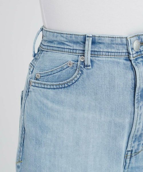 【デザイン】太腿から裾にかけて太いストレートシルエット。メンズの太めジーンズを女性が穿きこなすイメージです。メンズらしい印象にするため、あえて股ぐりを長くし、ヨークの幅や後ポケットを大きくしています。実際にメンズサイズを穿こうとするとウエストが合わなかったり、重さで下に下がってしまったり落ち着きが悪いですが、このジーンズは、ウエストがキュッとしまったジャストサイズなので、着心地のストレスなく穿いていただけます。ボリュームのあるパンツですが、ウエストがしまっていることにより、ウエストが細く見え、着ている人を華奢に見せてくれます。またボリュームが横に広がらず、ヒップの高さから下に落ちるので、後ろ姿の野暮ったさもありません。脚の形を気にせず穿ける太めストレートなので体型を選ばず着ていただけます。