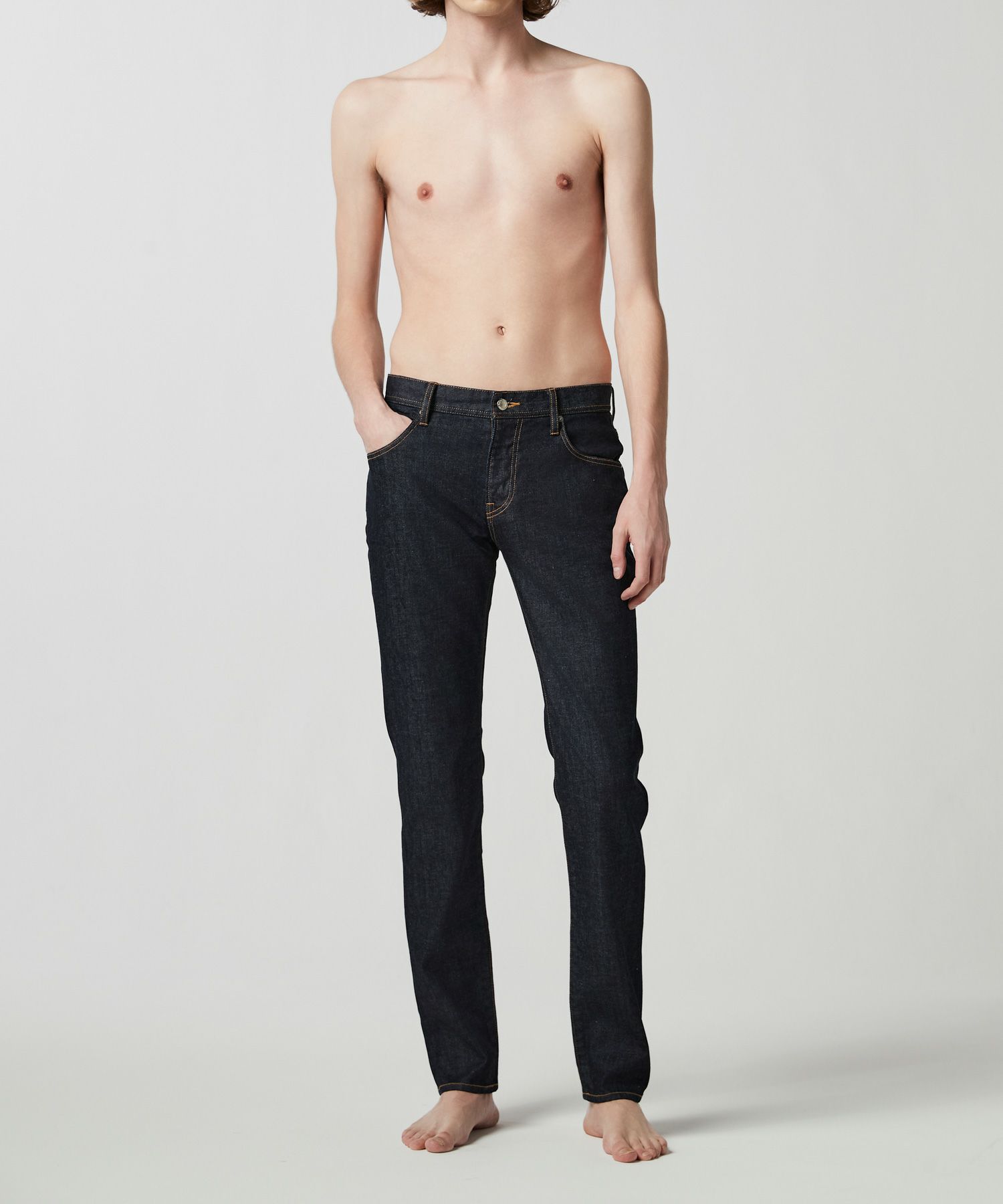 【デザイン】 シルエットと着用感に徹底的に拘ったスリムテーパードシルエットデニム。 全体をシャープに仕上げながらも、身体のラインが出過ぎない程良いゆとりをもたせ、膝下は細く絞り無駄なもたつきを抑えています。