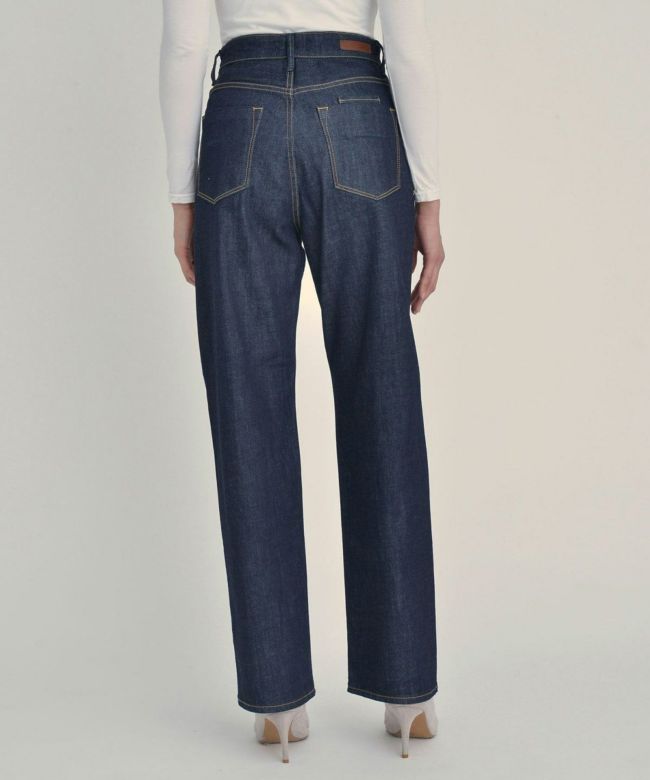 【素材】 定番のストレッチデニムでほど良いハリ感とリラックス感のある履き心地で、硬いイメージがあるワンウォッシュカラーでも快適に穿いていただけます。きれいにまとまるワンウォッシュの色味としっかりと深さのある股上で、カジュアルなトップスはもちろんテーラードジャケットなどのキレイめアイテムとも相性がよく、季節や気分によって合わせるアイテムを変えられる着回し力抜群な1枚です。ウエストベルトの裏地を色移りしにくいデニム生地を使用しているので、トップスインでも穿いていただけます。