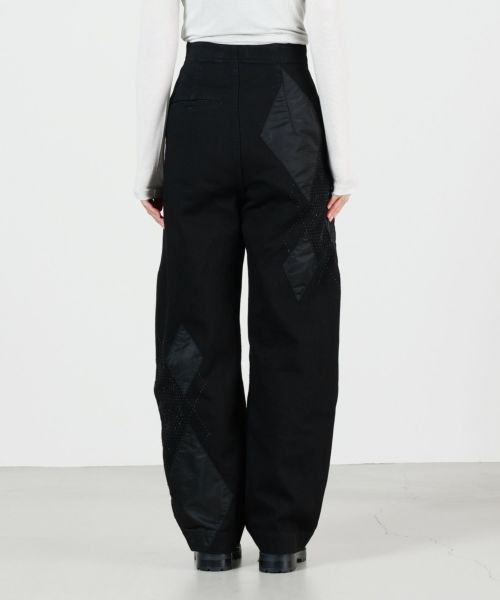 【デザイン】デニムとナイロンをコンビネーションで合わせたカーブシルエットのパンツ。 レーザーによるパンチング加工でアーガイル柄を表現しており、縫製後に洗いをかけることによって、パンチング部分に花が咲き、より立体的な表情が生まれています。 ナイロンをドッキングすることで、華やかな光沢感がある新しいデニムパンツです。