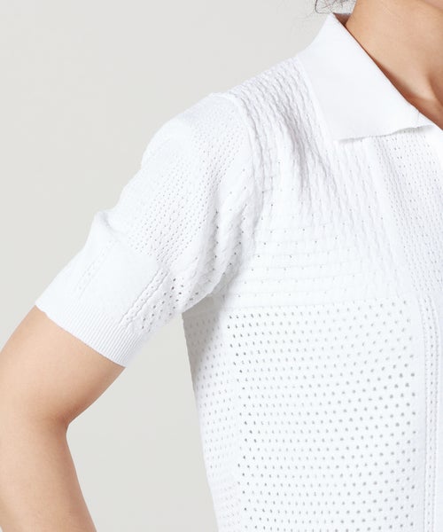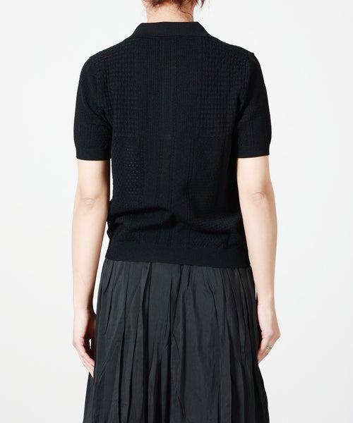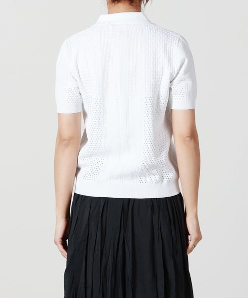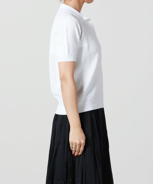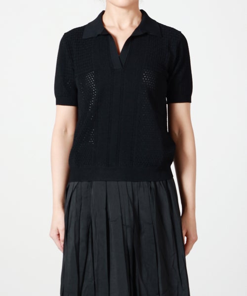 【デザイン】roberto collina(ロベルトコリーナ)のニットポロシャツ。Vネックとボタンレスのカラーが、シンプルながらも洗練された印象を与えます。編地切り替えとリブ編の縁取りが特徴で、軽やかでフェミニンな雰囲気を持ちながらも、カジュアルに着こなせるバランスが絶妙です。