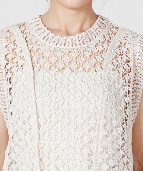 【素材】 ナチュラルなニット素材を使用。手に取るとシャリ感のあるドライなタッチが特徴で、肌にまとわりつきにくく、暑い時期でも快適に着用いただけます。見た目にも軽やかで、レース編み特有の透け感が涼しげな印象を演出。しっかりとした編み地ながらも通気性に優れており、春夏シーズンにぴったりの素材感です。伸縮性は控えめなため、身体のラインを拾いすぎず、すっきりとしたシルエットをキープします。