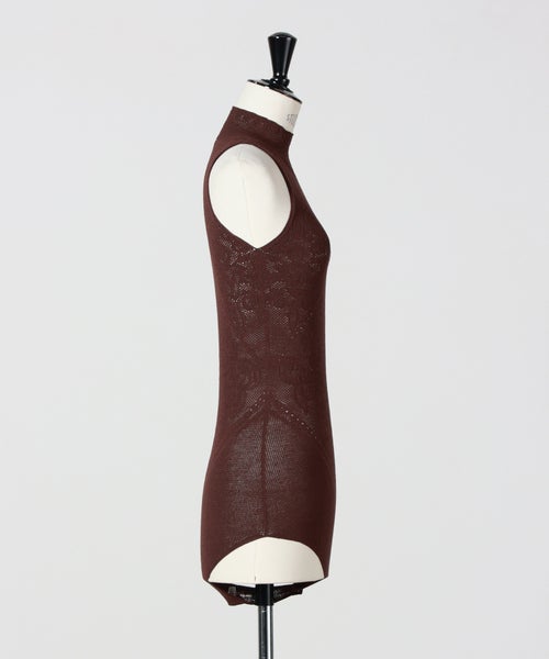 【デザイン】FETICO(フェティコ)のボディスーツ。繊細なレース素材を全面に使用した、エレガントかつセンシュアルな印象のノースリーブデザインです。ややハイネックのディテールが首元を美しく引き立て、コンパクトなシルエットがボディラインに沿って女性らしい曲線を強調します。ボディスーツ仕様のためウエスト周りがもたつかず、タックインした際もすっきりとした着こなしが叶います。1枚で存在感がありながら、ジャケットやシャツのインナーとしても活躍し、スタイリングに奥行きを与えてくれます。