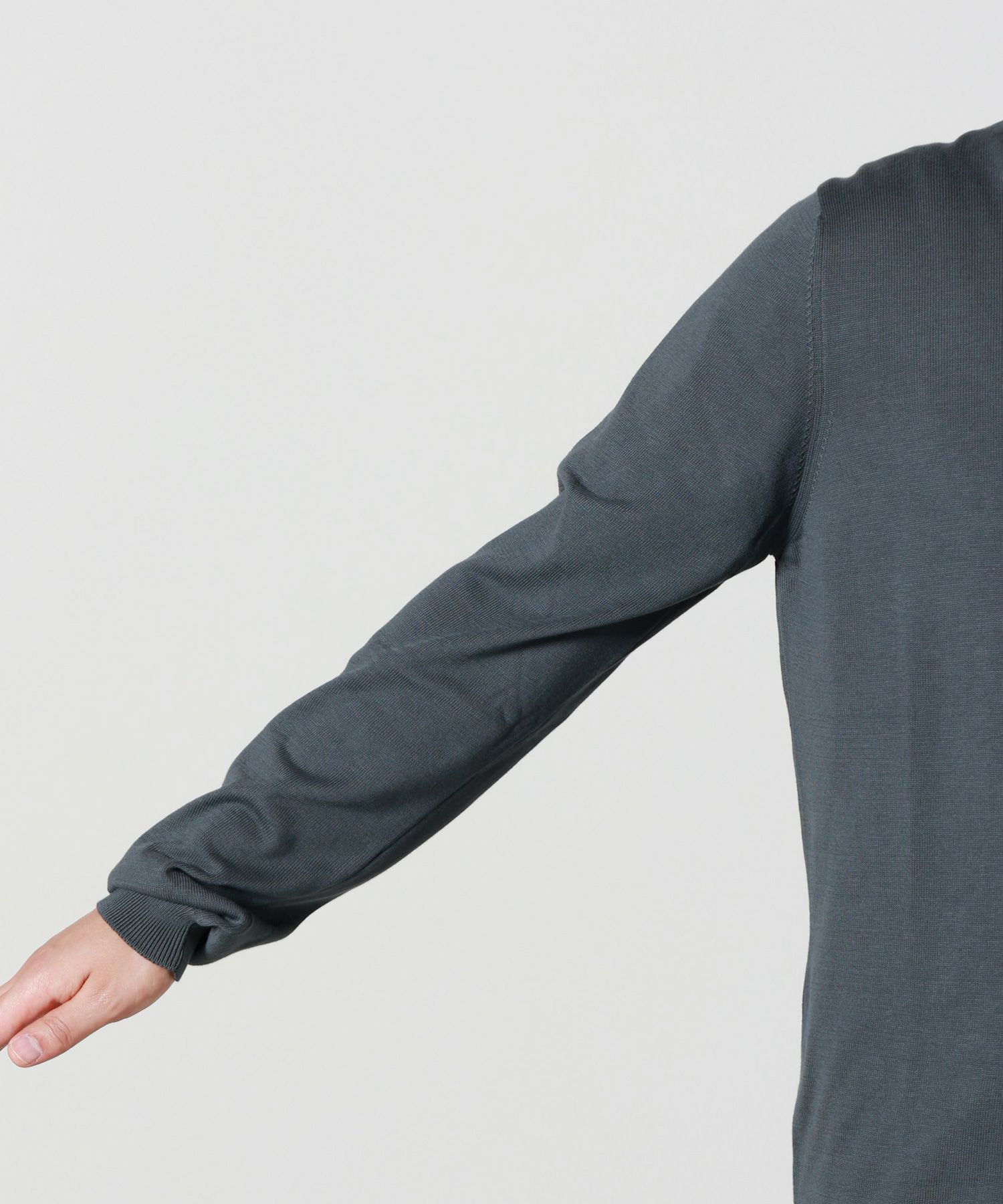 【素材】 コットン100%のハイゲージ編みを採用。薄手ながら目の詰まった編地は、見た目に清涼感がありながらも透けにくく、着用時にはさらりとした心地よさを感じられます。肌に優しく柔らかいタッチで、インナーとしても一枚着としても快適。自然な光沢感があるため、上品な印象を演出しつつ、デイリーに取り入れやすい素材感です。シーズンを問わず着回しができる、実用性の高い一着となっています。