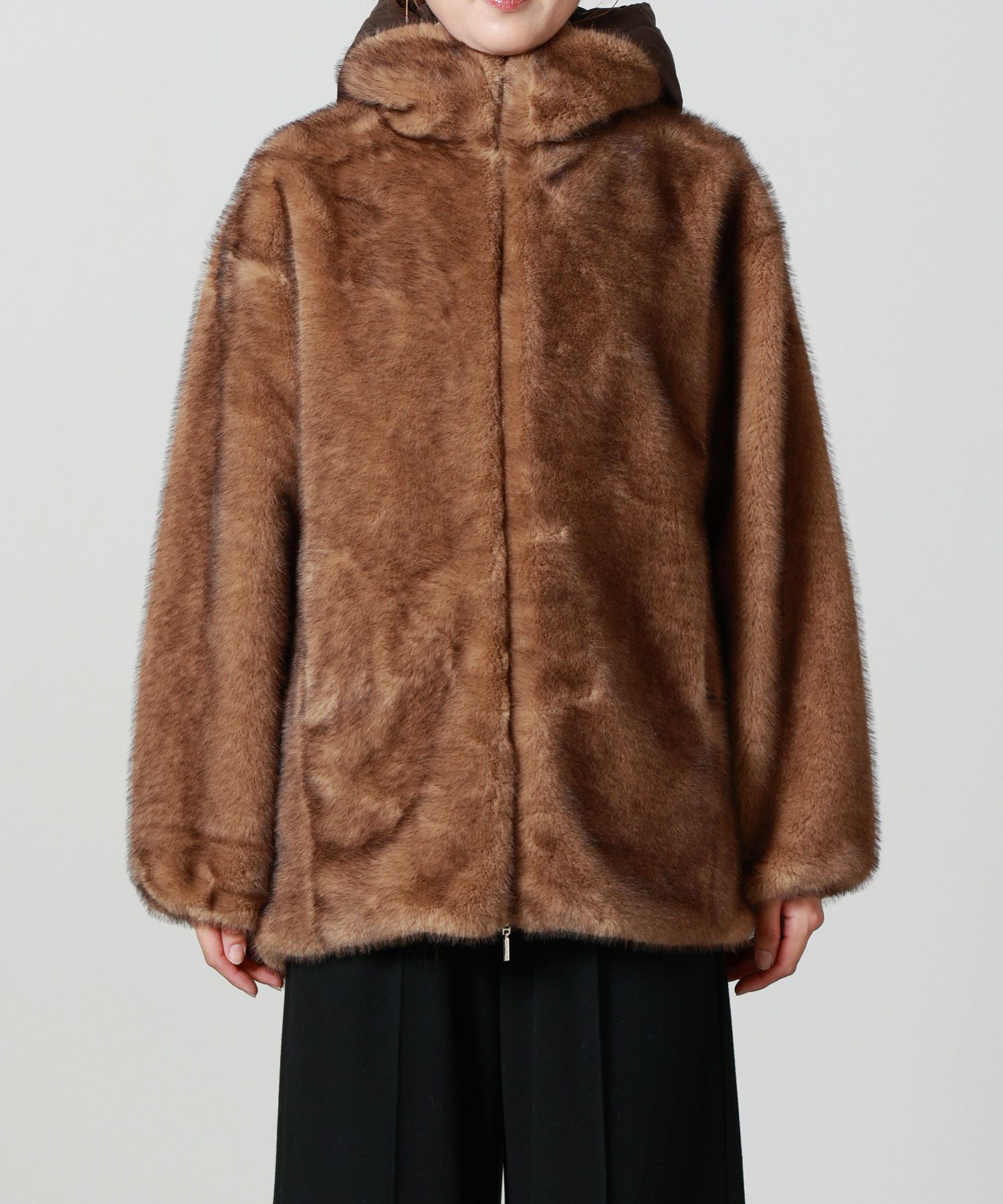【素材】 表地はポリエステル100%。しっかりとしたハリのある素材感でありながら、軽やかな着心地を実現。マットな質感のファーは手触りも柔らかく、見た目にもリッチで落ち着いた印象を与えます。取り外し可能なライナー付きのため、保温性と通気性をシーズンに応じて調整できるのも嬉しいポイント。内側まで丁寧に作り込まれており、長時間の着用でも快適に過ごせます。防風性にも配慮された仕様で、冬のデイリーアウターとして頼れる存在です。
