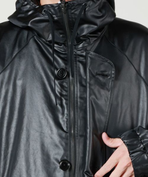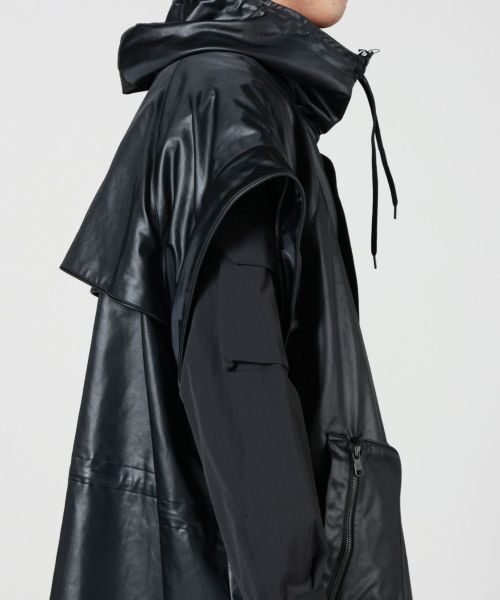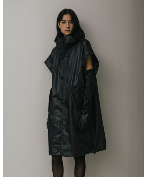 【デザイン】 08sircus(08サーカス)のコート。ヴィンテージレザーのような質感が特徴的なフーディーコートです。熱加工により重厚な表情を生み出しつつ、撥水性を備えた高機能素材でモードと実用性を融合させた佇まいが魅力。 袖は取り外しが可能で軽やかなアウターへと変化させることができ、スタイリングや季節に応じた着こなしが可能です。脇のファスナーを開けるとスリットが生まれ、レイヤードに奥行きとアクセントを加えます。機能性とデザインが共存し、現代的な空気感を纏った一着です。