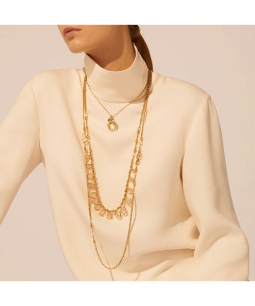 【デザイン】GOOSSENS Paris(ゴッサンスパリ)のネックレス。フェミニンで繊細なカシュミール コレクションは、インディアン ジュエリーからインスピレーションを得ています。イエローゴールドのチェーンに、しずくの形にカットされたロッククリスタルが美しいアイテム。自然光が当たるとその純度が明らかになり、きらめきを感じられます。