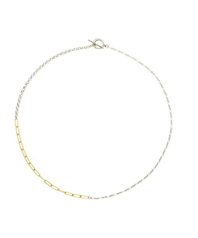 【デザイン】3種類のチェーンを組み合わせたネックレス。華奢なシルバーチェーン2種にイエローゴールドのスクエアチェーンを組み合わせています。ロングネックレス、Y字ネックレス、チョーカーにバックチェーンと、着こなしに合わせてお好きなバランスで着用できるアイテムです。