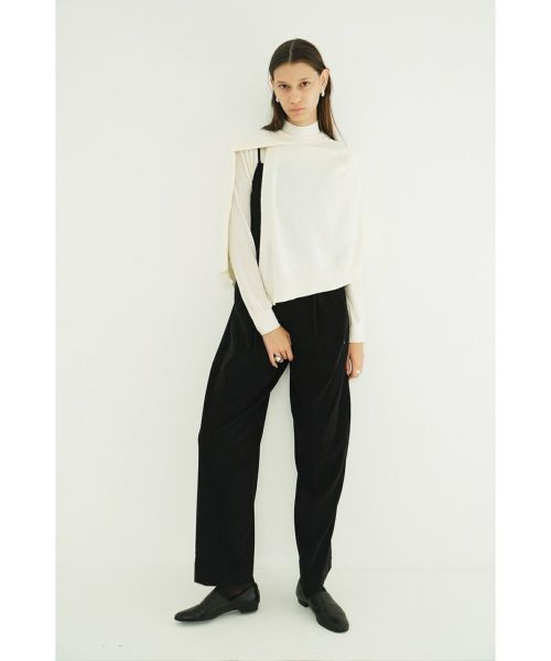 【デザイン】 CLANE(クラネ)のハイウエストデザインのオールインワン。ウエスト位置を高めに設定することで、スタイルアップ効果も抜群。ボトム部分は程よくボリュームがありつつも、落ち感のあるシルエットで体のラインを拾いにくく、リラックス感と美しさを兼ね備えた仕上がりに。また、首紐は取り外しも可能で、着こなしに合わせて雰囲気を変えられるポイント。カジュアルなニットや、きれいめなシャツとも好相性で、さまざまなスタイリングアレンジが楽しめます。
