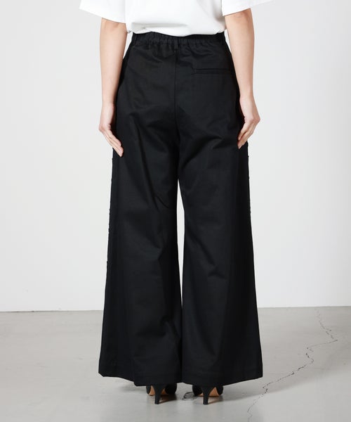 【デザイン】LOKITHO (ロキト) のパンツ。 ワイドシルエットとハイウエストデザインで、脚長効果と程よいリラックス感を両立。両サイドに施されたコード刺繍が控えめながらも存在感を放ち、ツータック仕様により腰まわりに柔らかな立体感を演出。バック部分のみゴム仕様で、着脱がスムーズでストレスフリーな着心地です。シンプルなトップスと合わせるだけで、上品で洗練されたコーディネートが完成します。