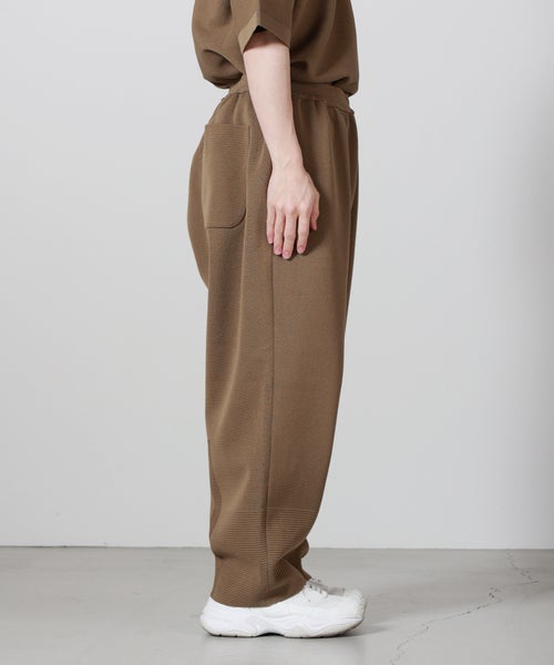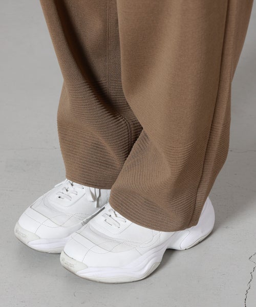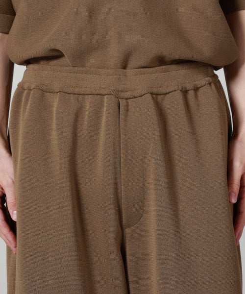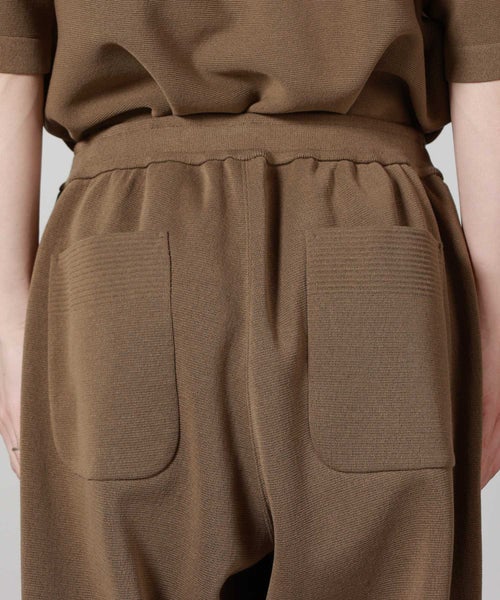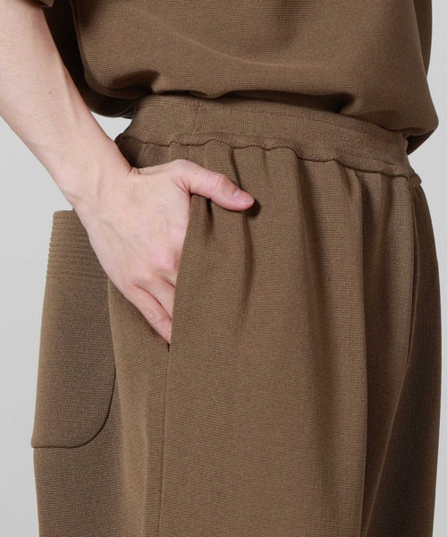 【素材】綿75%とポリエステル25%を使用。シャリ感のある肌触りが心地よい素材で、適度な厚みとハリがありシワになりにくく、手にした際には安心感のある質感が特徴です。着用時はニットならではの伸縮性があり、動きやすく快適な穿き心地が叶います。環境に配慮した素材選びがされている点も魅力です。