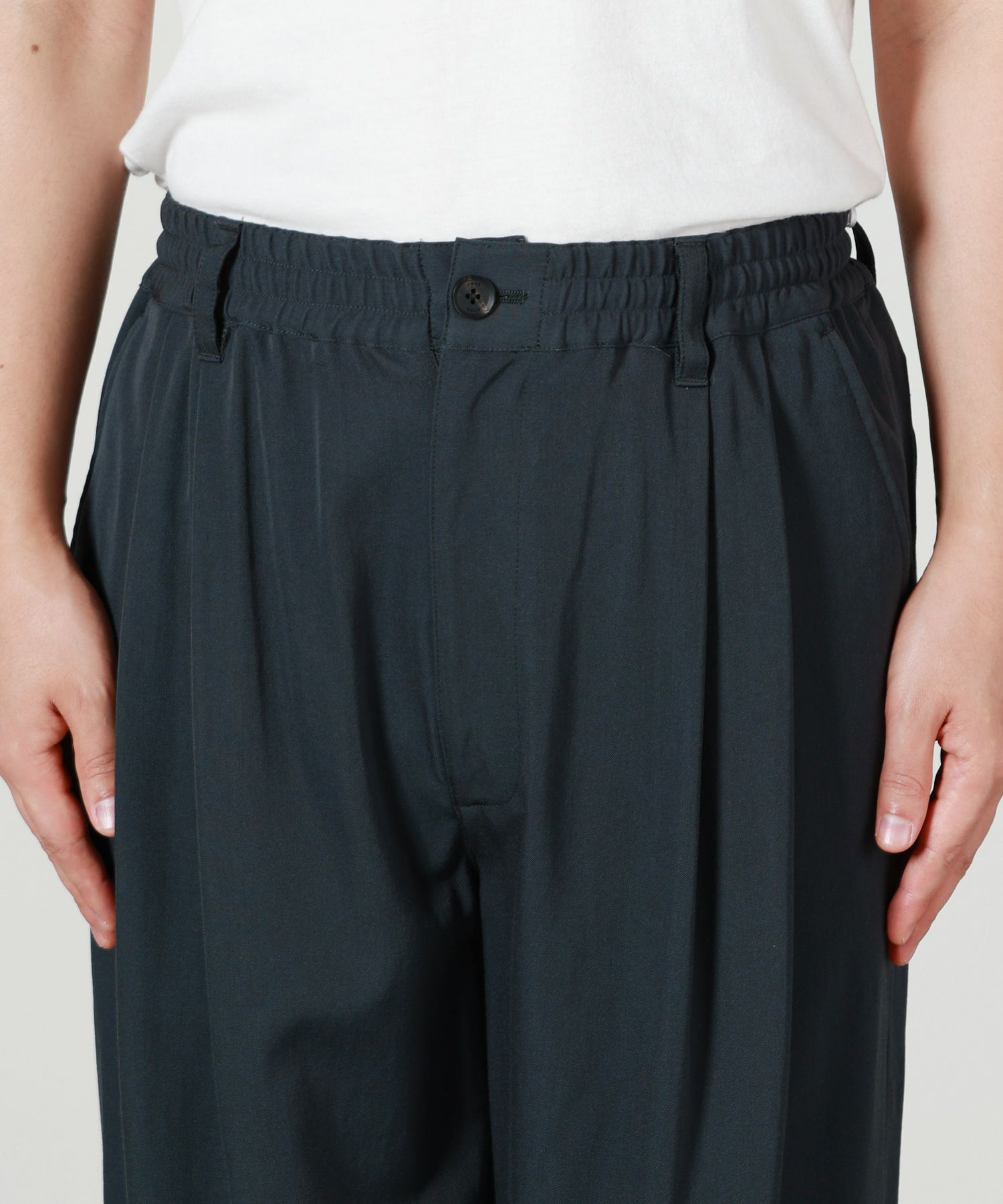 【デザイン】 YOKE(ヨーク)のパンツ。 新型の2タックイージートラウザーズ。 深めのアウトタックにより腰回りに立体感を持たせ、ワイドシルエットながらすっきりとした印象に仕上げています。 ウエストは太めの平ゴムとスピンドルで調節可能なイージー仕様。 リラックス感のある着用感ながら、上品でモダンなスタイリングに合わせやすいデザインです。
