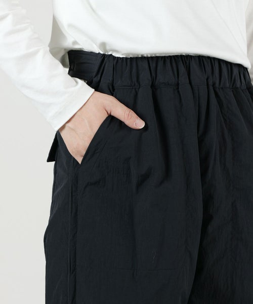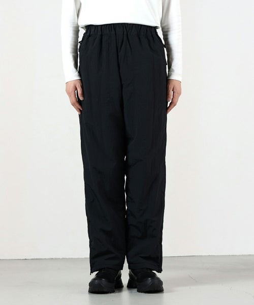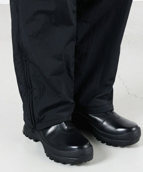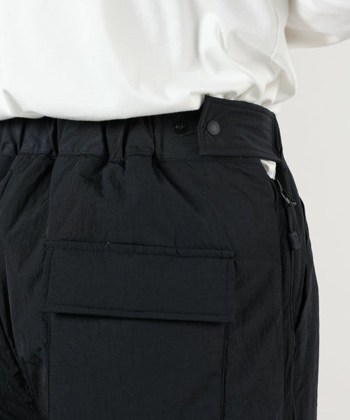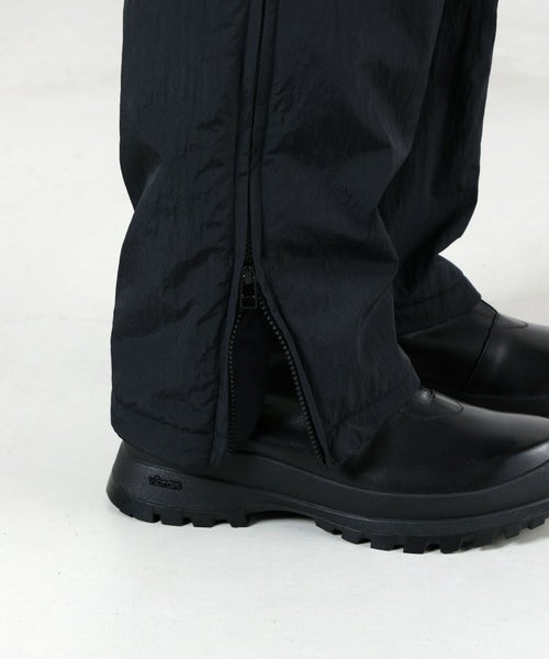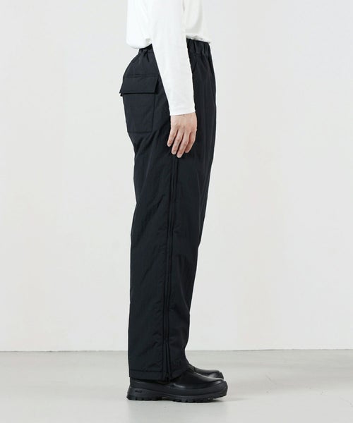 【デザイン】 YOKE(ヨーク)のパンツ。生地の表面に程よい表情のある、ミリタリートレーニングパンツです。横糸に黒を使用することで、シャンブレー効果を生み出しており、メタリックな光沢感を演出しています。特殊ワッシャー加工を施し、表面にシボ感を出し塩縮されたような質感に。仕上げに撥水加工を施した、機能的な面も持ち合わせたアイテムです。