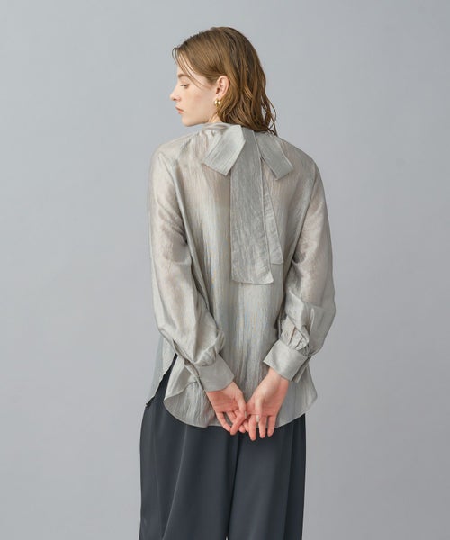 バックリボンがアクセントになったシャイニーブラウス。 ゆったりとしたシルエットで体型を拾いにくく、スタイルアップも叶えます。ハイネックデザインでクラシカルな雰囲気を演出。