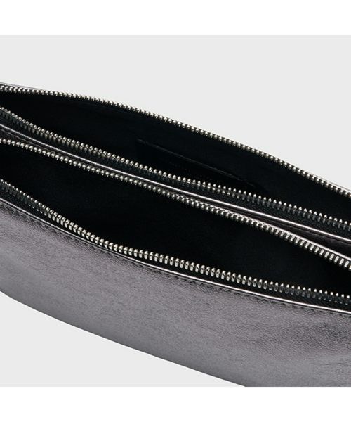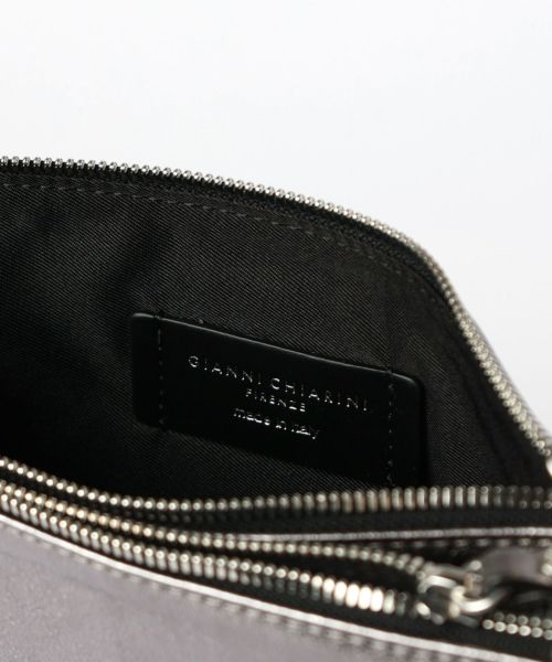 【デザイン】GIANNI CHIARINI(ジャンニ・キアリーニ)のバッグ。シルバーでシャープな印象のレザーを使用したHERMY(ハーミー)。携帯やミニウォレット、口紅などの必需品がしっかり収まります。薄型のコンパクトなサイズ感が上品な印象で休日の身軽なお出かけにはもちろん、パーティーシーンにも大活躍。長さ調節可能なショルダーストラップ付きで、肩がけや斜めがけでお持ちいただけます。 内ポケット:なし