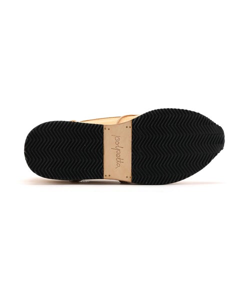 船底の様なアウトソールは地面に添いながらスムースな一歩を踏め出すことる形状となっております。アウトソールはゴムとレザーのダブルフェイス。 つま先は剥がれを防止するために職人がハンドソーンで縫い上げるなど、細やかな技術が詰まった一足です。
