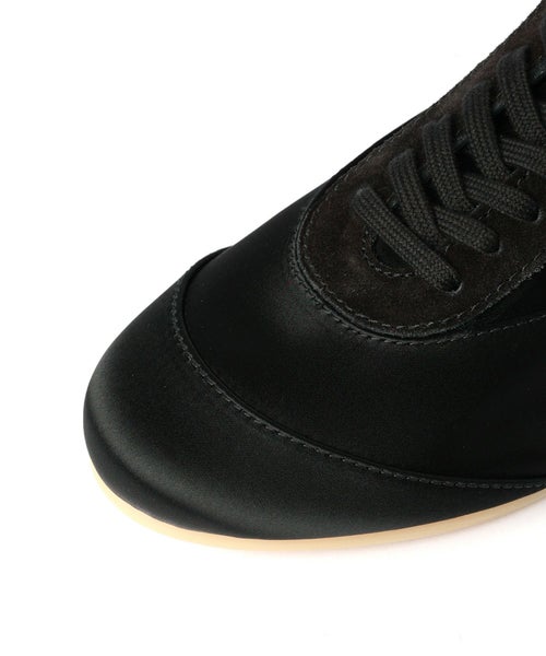 【素材】 アッパーにはコットンとアセテートを主成分とした素材を使用しており、上品で光沢のあるサテンの質感が特徴です。触れると滑らかで、光の当たり方によって微妙に表情を変えるその素材感は、視覚的にも非常に美しく、まるで上質なシルクのような手触りです。スエードトリム部分は、カーフレザーを使用しており、しっとりとした質感とともに高級感を引き立てています。足元に安定感を与えるラバーアウターソールも、グリップ力があり、快適な歩行をサポートします。インソールやライニングのレザーが、さらに履き心地を向上させ、足を包み込むようなフィット感を実現。見た目だけでなく、履いた時の心地よさや耐久性にもこだわりが感じられる一足です。